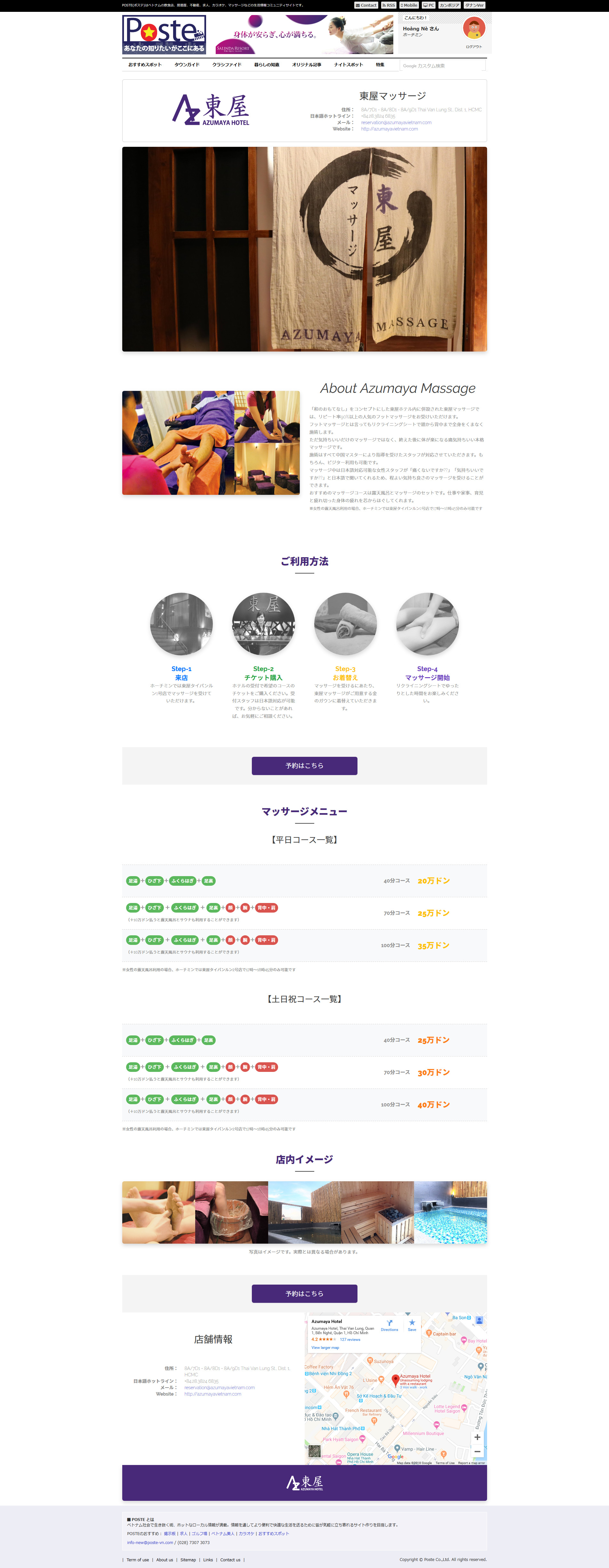 - 紹介ページにマッサージの種類や料金、ホーチミン・ハノイ・ダナンの各店舗の営業時間など、利用者がお店に行く前に気になることを日本語で詳しく紹介しました。