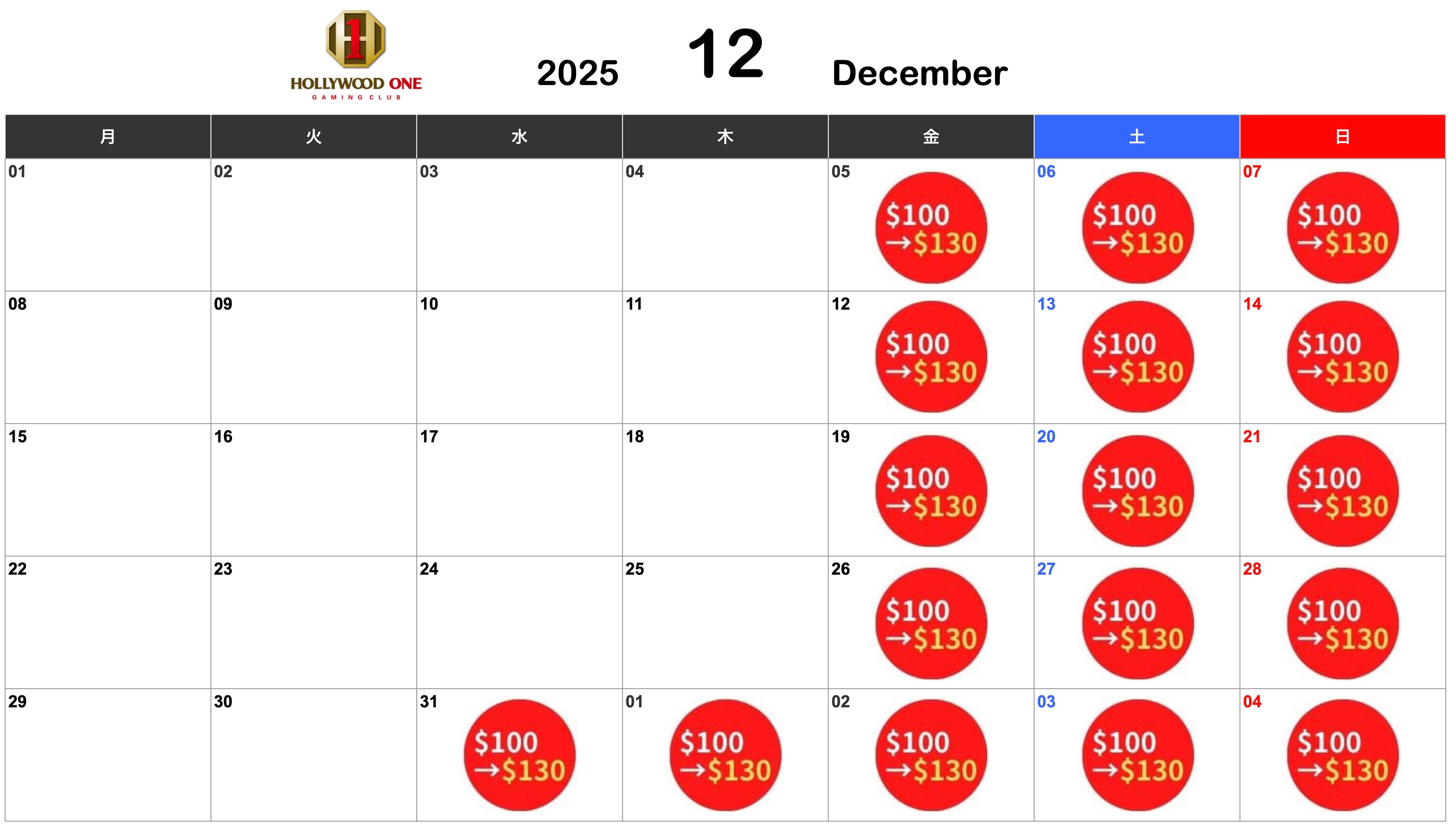 年末年始&金・土・日の週末は…100ドルキャッシュインで130ドルバウチャーをプレゼント!!
