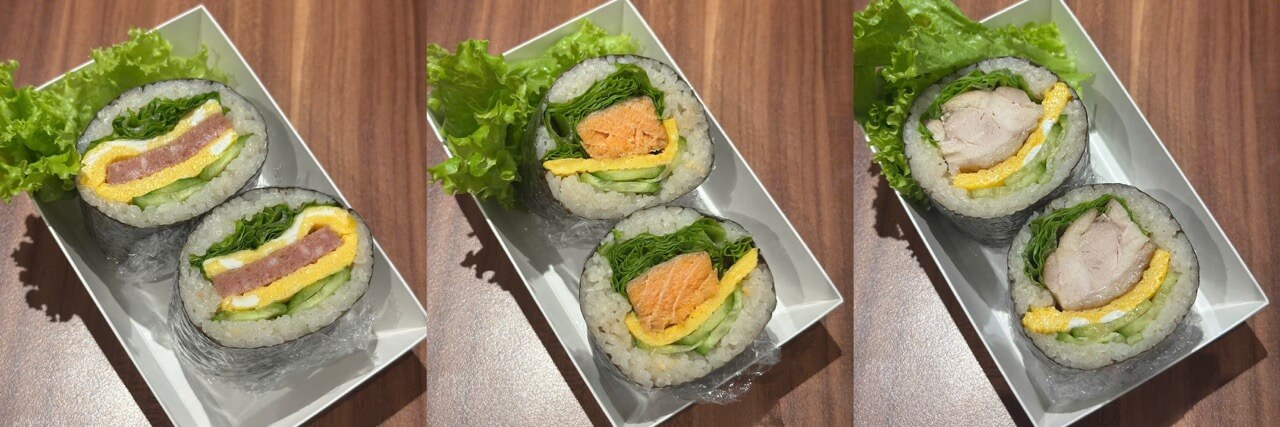 おすすめは「ポークたまご」「焼き鮭」「鶏肉の照り煮込み」で、ほのかに味付けされた米に、レタスやキュウリが合わさったさっぱりとした味わいです。