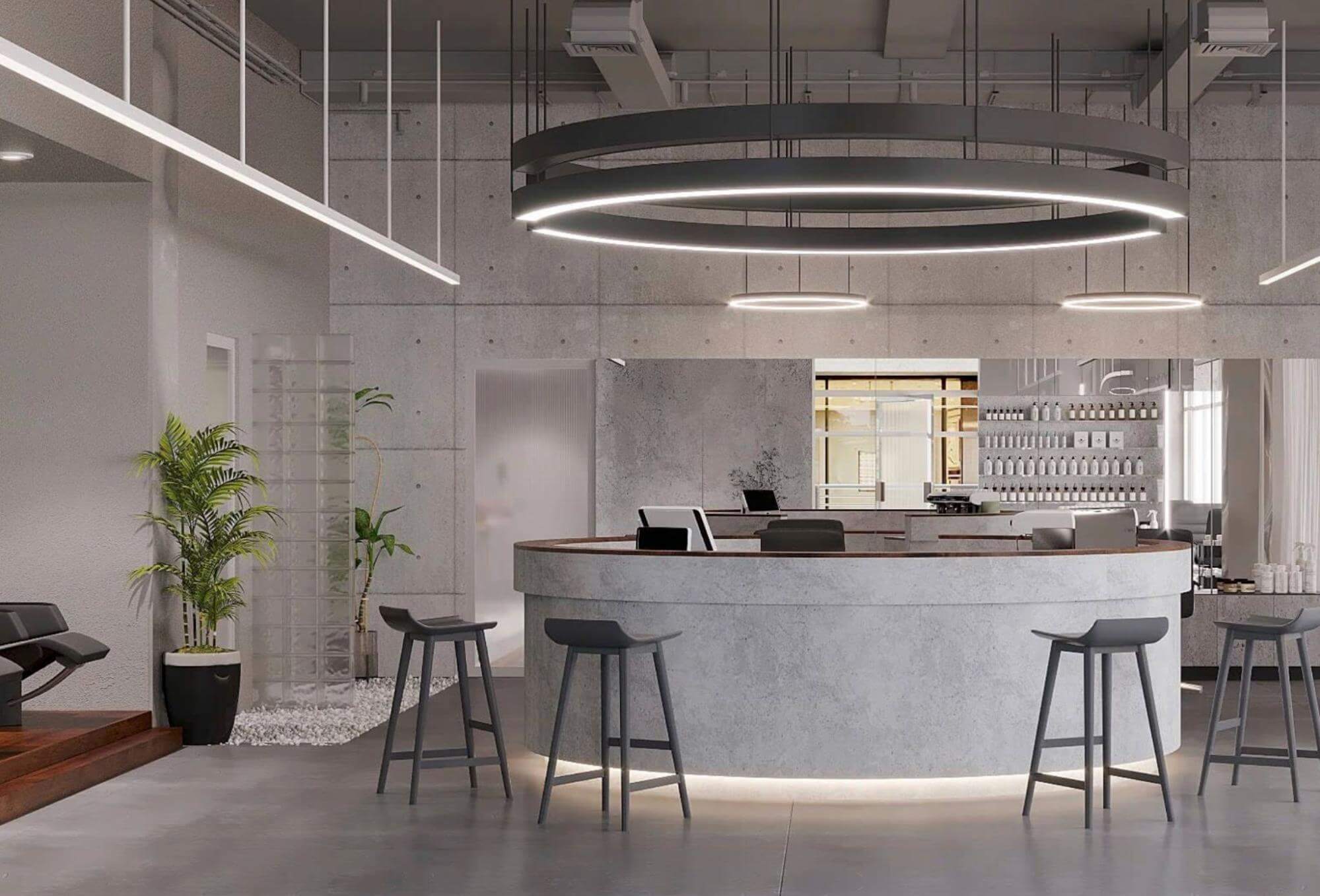 店内はモノトーンかつミニマルなデザインで、カフェのような大きな円形カウンターではコーヒーも楽しめるなど、開放感が抜群です。
