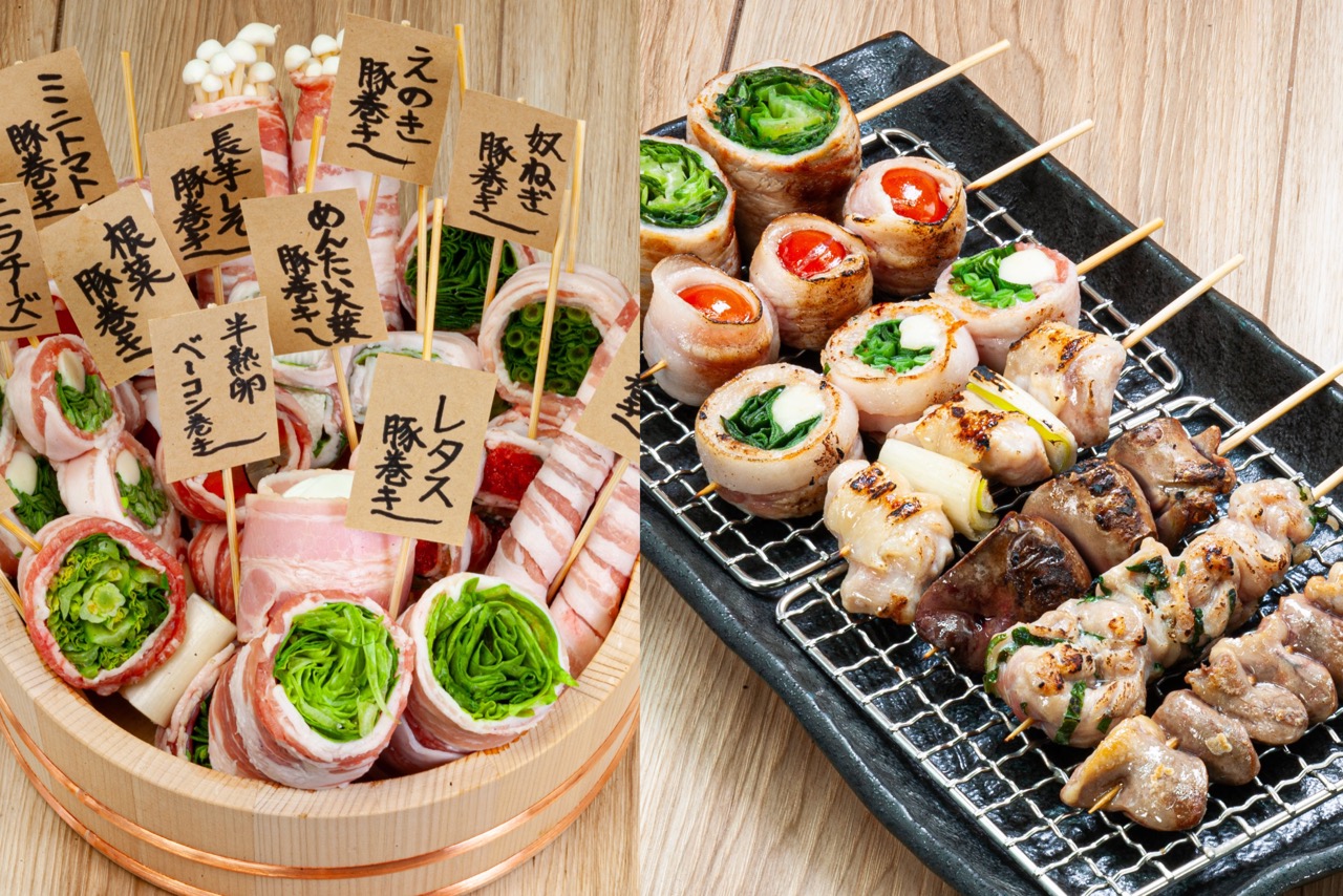 今回新たに加わった新メニューは炭⽕で焼き上げる野菜巻き串や本格焼き⿃など…