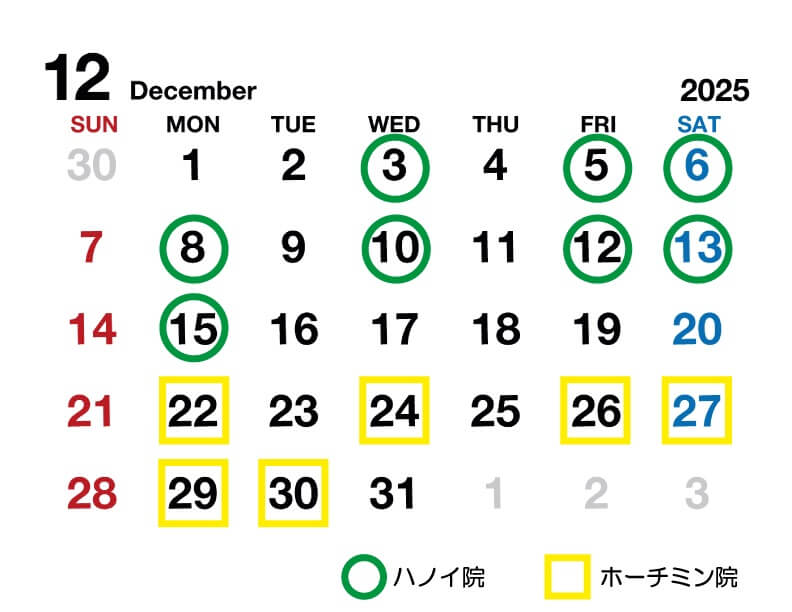 - ハノイ:1日(土)・3日(月)・4日(火)・10日(月)・12日(水)・14日(金)・17日(月)