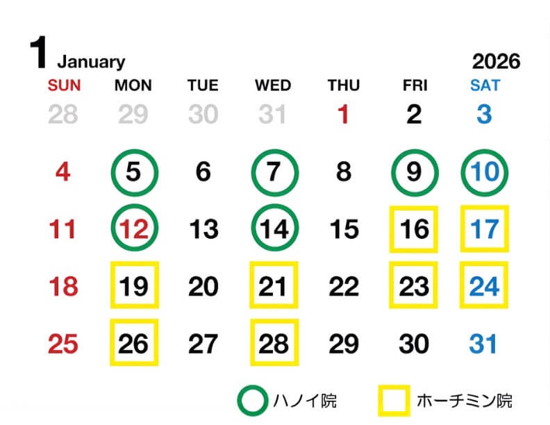 - ホーチミン:16日(金)・17日(土)・19日(月)・21日(水)・23日(金)・24日(土)・26日(月)・28日(水)